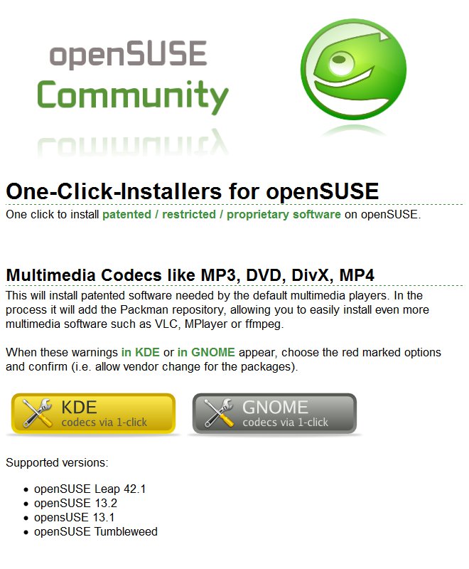 Da die codecs von Kaffeine üblicherweise fehlen, habe ich mich an die 'codecs-kde.ymp' erinnert. Auch in den vorherigen Versionen von openSUSE wurden sie von mir installiert und haben zum gewünschten Erfolg geführt. Mit dem Browser lade ich mir die codecs in meinen Downloadordner herunter.