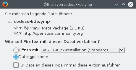 Da die codecs von Kaffeine üblicherweise fehlen, habe ich mich an die 'codecs-kde.ymp' erinnert. Auch in den vorherigen Versionen von openSUSE wurden sie von mir installiert und haben zum gewünschten Erfolg geführt. Mit dem Browser lade ich mir die codecs in meinen Downloadordner herunter.